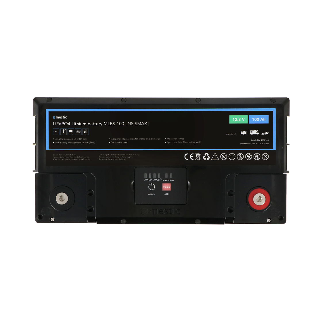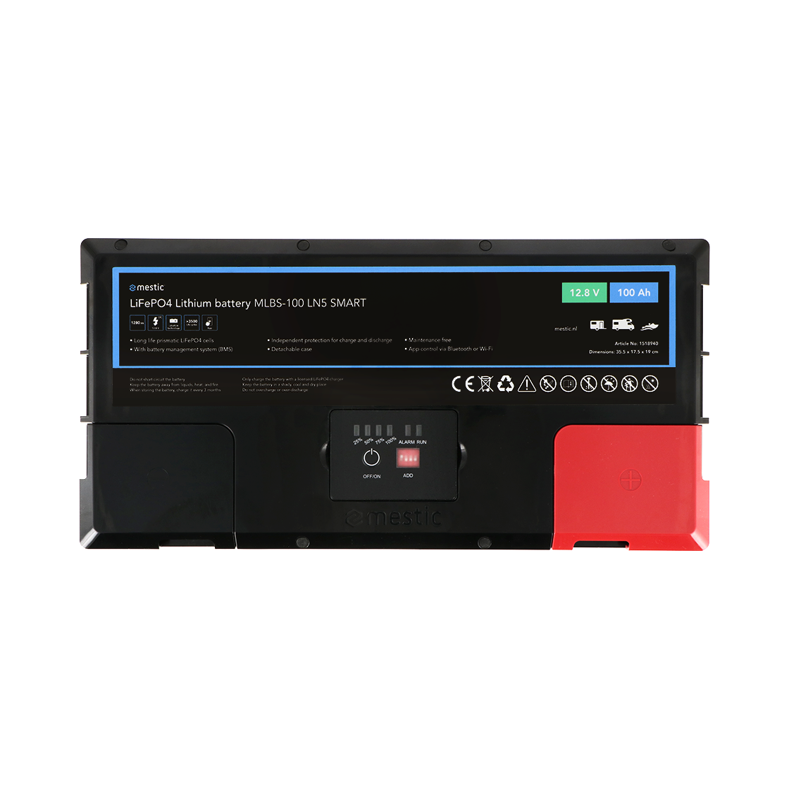 L'MLBS-100 LN5 smart è una batteria al litio da 100Ah dotata di celle LiFePO4 di alta qualità per prestazioni eccellenti e lunga durata. Il sistema di gestione della batteria (BMS) integrato protegge costantemente la batteria da sovraccarico, surriscaldamento e scaricamento profondo. Grazie alla funzione di riscaldamento incorporata, è possibile caricare la batteria anche a temperature fino a -20 °C. La batteria dura anche molto a lungo, con oltre 3500 cicli di carica al 100% di scarica.